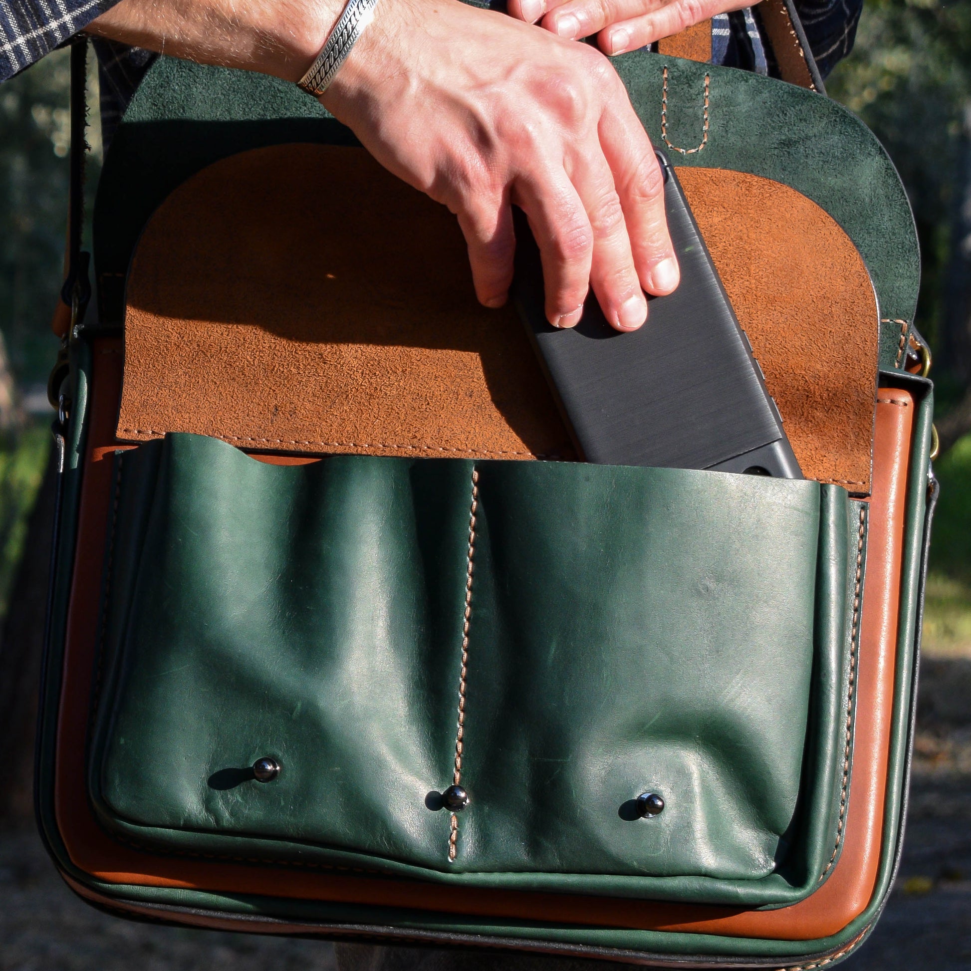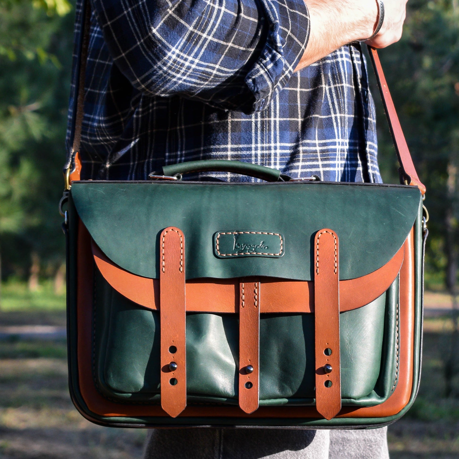 ტყავის ჩანთა არის სრულად ხელით დამზადებული ნატურალური ქართული ტყავისგან. მწვანე და ყავისფერი ტყავის კომბინაცია.